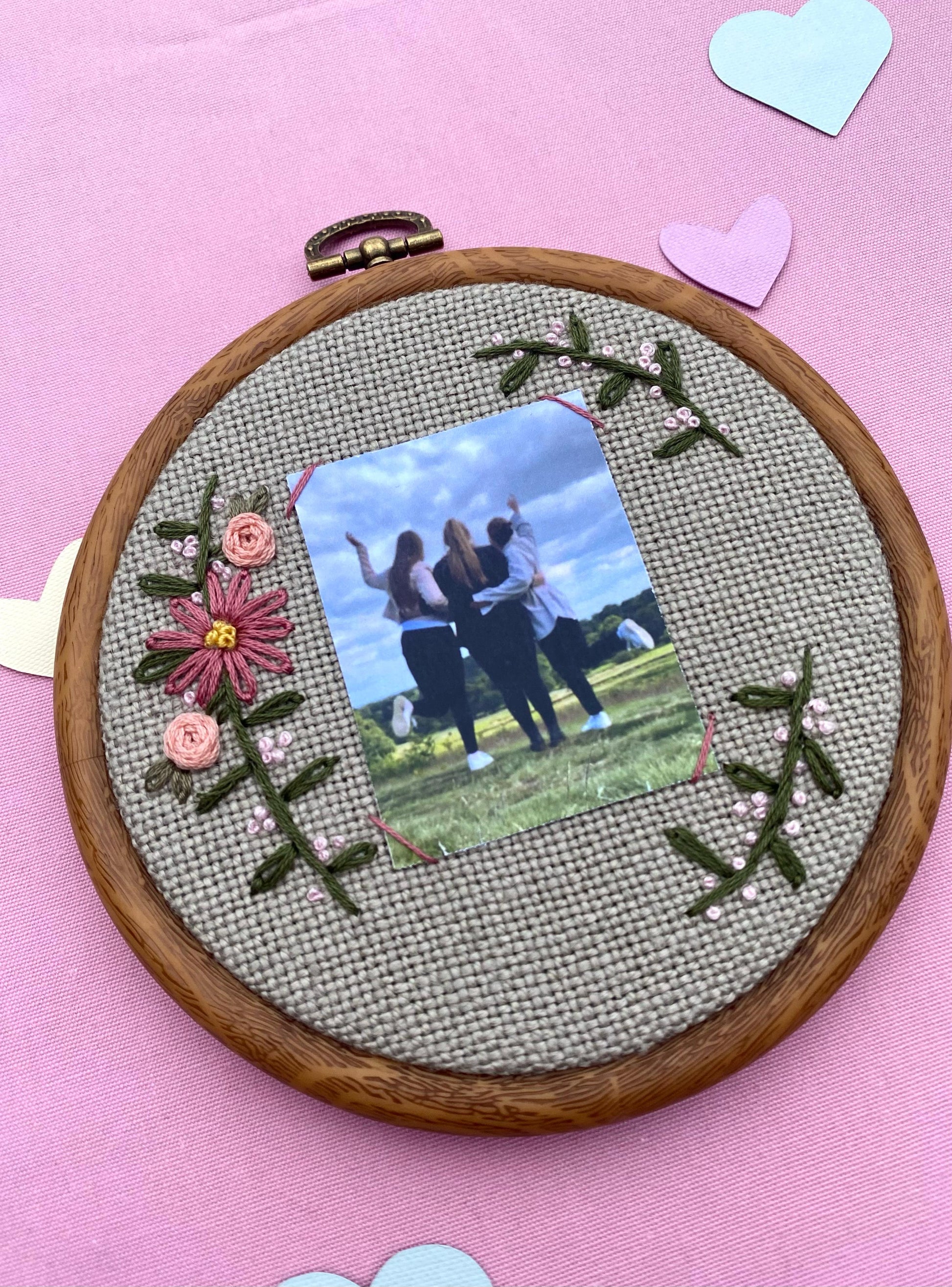 Hand Embroidered Photo Frame - Circle Shape - Pink Flowers